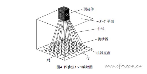 近年來(lái),許多學(xué)者對(duì)矩形編織材料細(xì)觀結(jié)構(gòu)給予了高度的關(guān)注,逐步建立了由簡(jiǎn)單“米”字型到三維實(shí)體的單胞幾何模型,推動(dòng)著力學(xué)模型的發(fā)展。鄭錫濤和葉天麒[13]系統(tǒng)地研究了四步法1×1方型編織工藝編制的預(yù)成形件及其增強(qiáng)的復(fù)合材料的細(xì)觀結(jié)構(gòu)。提出了紗線橢圓形橫截面假設(shè),考慮了編織紗線的細(xì)度和編織紗線填充因子的影響,創(chuàng)建了正軸模型。根據(jù)編織過(guò)程中攜紗器的運(yùn)動(dòng)軌跡特點(diǎn),將預(yù)成形件劃分為三個(gè)不同的區(qū)域,分別定義了不同的控制體積單元,識(shí)別了編織結(jié)構(gòu)參數(shù)之間的關(guān)系,同時(shí)給出三維編織復(fù)合材料的設(shè)計(jì)方法,三維編織示意圖見(jiàn)圖4。馮偉和馬文鎖[14]將編織物中連續(xù)的紗線離散開(kāi)來(lái)并用特殊的點(diǎn)符號(hào)表達(dá),用點(diǎn)群和空間群分析現(xiàn)有編織材料幾何結(jié)構(gòu),一方面可以合理地對(duì)現(xiàn)有編織材料幾何結(jié)構(gòu)進(jìn)行描述和分類(lèi);另一方面也可以將該理論用于推導(dǎo)編織材料幾何結(jié)構(gòu)新的和更為有效的編織方法。張美忠等[15]由于編織復(fù)合材料實(shí)際結(jié)構(gòu)的復(fù)雜性,為了使研究結(jié)果更真實(shí),用現(xiàn)有成熟的有限元軟件仿真三維編織復(fù)合材料,并研究其各項(xiàng)力學(xué)性能已成為一種趨勢(shì)。