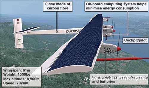 “陽(yáng)光動(dòng)力號(hào)”飛機(jī)原型的機(jī)翼類似空客A340,長(zhǎng)63.4米,其上集成了200平方米的光伏電池面板,由12000塊厚度僅為180微米的單晶硅光伏電池板組成,晝夜均可飛行。飛機(jī)主架結(jié)構(gòu)采用含碳素纖維和蜂巢的復(fù)合材料,以三明治式夾層法壓制合成,機(jī)身僅重1500公斤,比傳統(tǒng)飛機(jī)輕1600公斤 “陽(yáng)光動(dòng)力號(hào)”于21日開(kāi)始在瑞士東部迪本多爾夫進(jìn)行模擬飛行。項(xiàng)目團(tuán)隊(duì)聲稱,這次測(cè)試將由項(xiàng)目聯(lián)合創(chuàng)始人和飛行員來(lái)評(píng)估駕駛艙的配置和飛行數(shù)天對(duì)人體的影響。這架覆蓋著光伏電池、僅由太陽(yáng)能提供動(dòng)力的太陽(yáng)能樣機(jī)曾于2011年年中在歐洲完成了一系列飛行,并且還在布魯塞爾和巴黎航空展上亮過(guò)相。