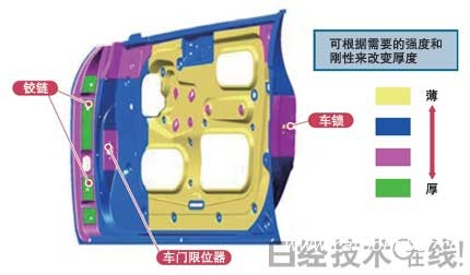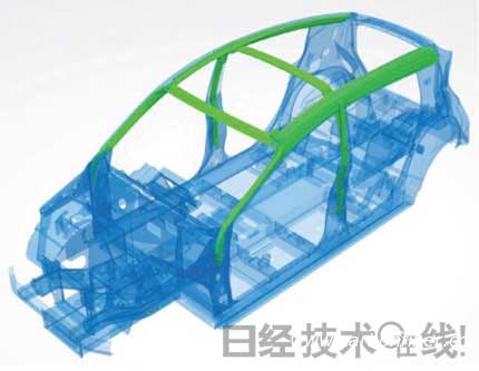 從前柱到天窗側(cè)、天窗強化材料以及中柱的上半部分等(圖中綠色部分),采用了液壓成型材料。