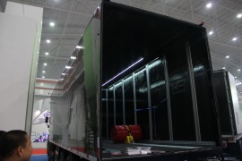 遭遇最多人圍觀的就屬碳纖維箱體車了,該車采用廣汽日野底盤,碳纖維材質(zhì)的9.6米車廂僅重1.6噸,底盤采用貫穿梁設(shè)計(jì),加上較薄的碳纖維車廂,箱體容積達(dá)64.6立方米,配合液壓圍板車輛裝卸貨效率更高。外形上碳纖維材質(zhì)箱體,配合花紋,也顯得相當(dāng)漂亮大氣。