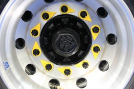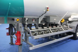 四軸鋁合金油罐半掛一下吸引住了小編的眼球,繞車一圈該車在設(shè)計(jì)上與國內(nèi)車型明顯不同,經(jīng)詢問該車主要出口馬來西亞,泰國等,還值得一提的是該車也配了輪胎緊固標(biāo)。