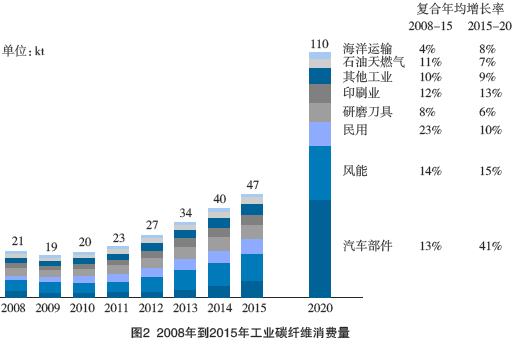 2010年,包括體育休閑和宇航在內(nèi)的工業(yè)應(yīng)用大約消耗了總產(chǎn)量31000t中的20000t,已占到碳纖維消費量的2/3(見圖1)。到2015年,體育休閑消費量將超過7000t/年,同時工業(yè)消費量應(yīng)從20000t/年增長到47000t/年,到2020年,甚至達(dá)到110000t/年(見圖2)。從中期看,風(fēng)電葉片可能是碳纖維需求的主要動力,而從長期看,汽車行業(yè)將促進碳纖維的需求。僅靠汽車行業(yè)就能改變碳纖維復(fù)合材料生產(chǎn)企業(yè)的面貌。 本文來自123