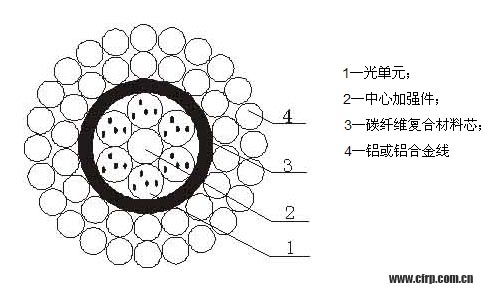 光纖復(fù)合架空地線(OPGW)是架空導(dǎo)線和光纖的復(fù)合體,具有傳輸電能和通信的雙重功能。隨著碳纖維復(fù)合材料在架空導(dǎo)線的應(yīng)用,光纖復(fù)合架空地線中使用碳纖維復(fù)合材料也將是指日可待的事情。由于碳纖維復(fù)合材料取代了鍍鋅鋼線或鋁包鋼線,這種新型的光纖復(fù)合架空地線也具有重量輕、強(qiáng)度高、低弛度、耐腐蝕、低線損的特點(diǎn)。碳纖維復(fù)合材料的優(yōu)勢突出體現(xiàn)它在大截面、大芯數(shù)的OPGW中的應(yīng)用。下面是這種使用新材料的OPGW的結(jié)構(gòu)圖。