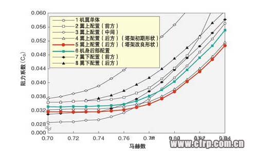 讓我們?cè)賮?lái)看圖2。通過(guò)改變引擎的配置方式(前後方向的安裝位置),馬赫數(shù)與阻力係數(shù)的關(guān)係會(huì)發(fā)生變化。翼上配置時(shí),阻力係數(shù)總體上高於單獨(dú)機(jī)翼,但配置在某個(gè)位置時(shí)卻出現(xiàn)了縮小。那就是引擎短艙尖端部的前後位置配置在機(jī)翼上表面發(fā)生的衝擊波附近的時(shí)候(圖中4、5)。如果從這個(gè)位置略微偏向前方,阻力係數(shù)就會(huì)猛增(圖中3)。與引擎配置機(jī)身後部的以往商用噴射飛機(jī)的做法相比,配置在這個(gè)位置時(shí)的阻力係數(shù)要小得多(圖中6)。