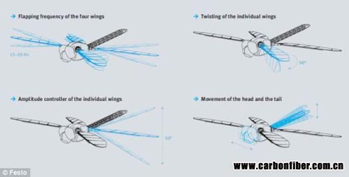與真正的蜻蜓一樣,BionicOpter能夠朝著任何方向飛行,進(jìn)行最復(fù)雜的飛行機動。此外,BionicOpter還能單獨振動每一個翅膀,用以進(jìn)行減速和急轉(zhuǎn)彎,加速和后退。費斯托公司的海因里希-弗洛特澤克博士表示:“之所以能夠擁有這種獨特的飛行能力要感謝輕量化設(shè)計以及所采用的各種裝置,例如傳感器、制動器、機械裝置以及開環(huán)和閉環(huán)控制系統(tǒng)。所有這些都安裝在一個非常狹小的空間內(nèi),彼此精確匹配。這意味著機器人第一次具備應(yīng)對直升機、有翼飛機和滑翔機面臨的所有飛行環(huán)境的能力。盡管在設(shè)計上非常復(fù)雜,這個高度集成的系統(tǒng)在操作方面卻非常簡單,可以使用智能手機進(jìn)行控制。”