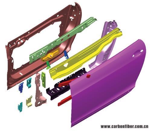 圖3 作為汽車復(fù)合材料領(lǐng)域的資深專家,Antony Dodworth表示,將碳纖維復(fù)合材料整合到轎車或卡車中的最大障礙主要發(fā)生在設(shè)計(jì)和工程開發(fā)階段。例如,一個(gè)復(fù)合材料的車門(上圖),能夠使用比金屬車門(下圖)少得多的部件被設(shè)計(jì)和制造出來