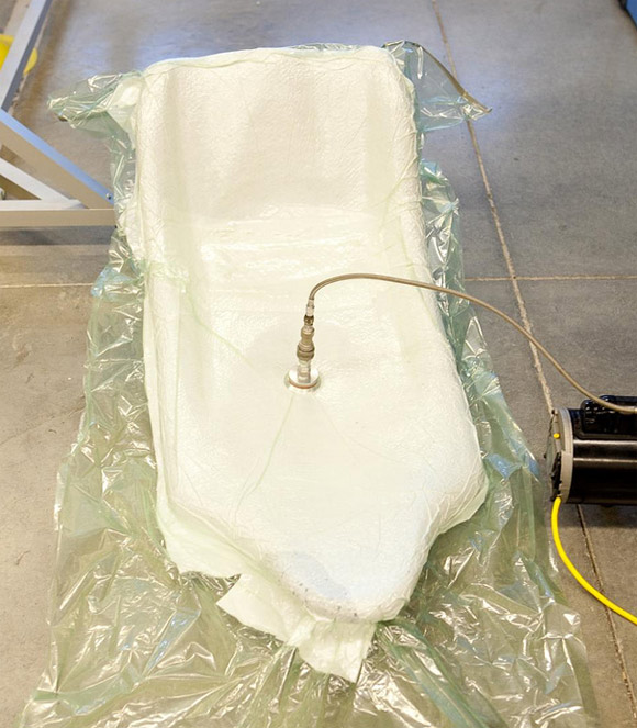 Because the bag is already prepared, the foam with wetted cloth, peel ply, and breather cloth can be placed directly into the bag and sealed quickly. Using a vacuum pump and valve, a vacuum was applied to the seat for about two hours. Figure 4 shows the part under the vacuum. Figure 5 shows how the perforated peel ply allowed extra resin to be absorbed by the breather cloth. This helped keep the seat weight to a minimum. Because the bag was sealed well, after removal of the vacuum, we experienced no problems with leaking.