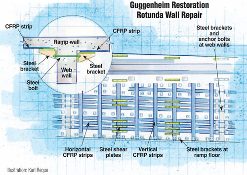 b)不增加結(jié)構(gòu)重量,碳纖維片重量200g/m.~300g/m,設(shè)計(jì)厚度0.1l1mm~0.167mm,加上環(huán)氧樹脂的重量也很輕,對(duì)結(jié)構(gòu)自重影響可忽略不計(jì);