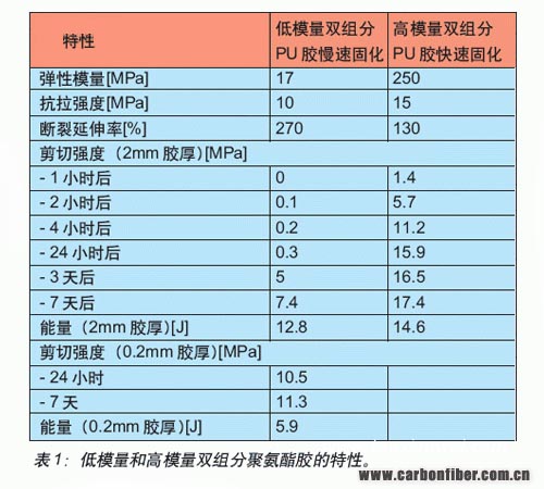 在汽車組裝過程中粘結(jié)部件時,雙組分聚氨酯結(jié)構(gòu)膠比較合適。這種膠可以加工成具有不同模量和斷裂伸長率。表1列出了兩種硬化率不同、彈性模量有低有高的雙組分聚氨酯結(jié)構(gòu)膠的性能曲線。
