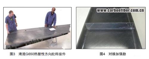 熱塑性復(fù)合材料主結(jié)構(gòu)件是一個過去即有涉獵的領(lǐng)域。灣流G550和G650 飛機(jī)的壓力艙壁板(圖2)是一系列帶壓力成型加強(qiáng)肋的碳/聚醚酰亞胺??湛虯400M 的駕駛艙地板就是用熱塑性復(fù)合材料制造的。最近,已經(jīng)著手焊接主操縱面。新型灣流G650 公務(wù)機(jī)(JEC2010 創(chuàng)新獎得主)的方向舵和升降舵就是感應(yīng)焊接的多肋扭力盒結(jié)構(gòu)(圖3)。