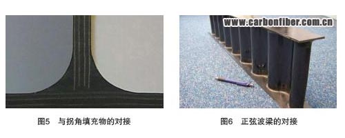 2003 年,一種碳/ 聚醚醚酮單向帶(Cytec)制成的客機(jī)地板梁得到發(fā)展。這種可高效制造產(chǎn)品很適合航空業(yè),因此,緯線鋪放(pick & place)被選作腹板和緣條的預(yù)成型體成型方法。所有這些元件都在共固結(jié)的過程中被熔合在一起。在研發(fā)工字梁組合件的過程中,曾經(jīng)尋求一種可簡化制造大量加強(qiáng)肋的方法。該方法是“對接”1 塊平層壓板,將其與普通工字梁共固結(jié)在一起(圖4)。這被證明是一個有效的解決方案。在制造上比最初設(shè)計的壓力成型加強(qiáng)肋的方法簡單得多。對接強(qiáng)度采用注射成型,增加了坡口圓角半徑,得到了優(yōu)化(圖5)。