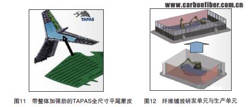雙曲面、7m 長的扭力盒是作為TAPAS 項目的一部分開發(fā)的,將于2011 年制造并驗證完畢。該產(chǎn)品是對灣流G650 平尾中段重新設(shè)計的產(chǎn)物(圖11),其蒙皮的特點是整體對接T 形加強(qiáng)筋。研究還在繼續(xù),以便確定熱壓罐外成型是否可行。纖維鋪放因其在鋪疊過程中對材料的浪費(fèi)最少而成為首選的鋪疊技術(shù)。蒙皮鋪疊將采用專業(yè)化的纖維鋪放設(shè)備單元。該設(shè)備單元將安裝GTech的Vericut 復(fù)合材料程序模塊,以便將CATIA 設(shè)計與機(jī)械手軟件鏈接起來。該設(shè)備單元只需少量投資即可開發(fā),滿足成批量生產(chǎn)12m 全尺寸蒙皮壁板的需求(圖12)。