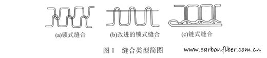 縫合技術(shù)發(fā)展至今已有悠久的歷史,但它在復(fù)合材料領(lǐng)域的應(yīng)用才不過幾十年,并且多被應(yīng)用在縫合層合板復(fù)合材料上。它是提高結(jié)構(gòu)損傷容限和層間斷裂韌性的有效途徑??p合工藝使用碳、玻璃、Kevlar做成的縫合線在工業(yè)縫紉機上對織物進行厚度方向的縫合。縫線僅占復(fù)合材料纖維體積含量的百分之幾。目前芳綸纖維由于其特殊的耐磨性、良好的抗沖擊韌性和較低的纖維密度,在縫合過程中得到廣泛應(yīng)用。鎖式縫合和鏈式縫合[6,7]是縫合線跡的兩種基本型式,如圖1所示。鎖式縫合會在面紗與底紗之間形成兩個縫合線圈,在織物中間相交,產(chǎn)生應(yīng)力集中;點改進的鎖式縫合可以穿過織物厚度,提高分層韌性和損傷容限,因此使用較多;鏈式縫合類似于針織,縫合線多次撓曲,操作復(fù)雜,使用較少。
