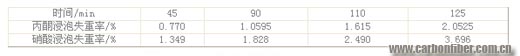 采用60%丙酮、100%硝酸作為溶劑進(jìn)行浸泡,不同浸泡時(shí)間下,碳纖維浸泡后的失重率見表3。