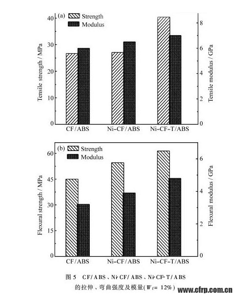 圖5(a)是未鍍鎳碳纖維(CF)以及不使用和使用偶聯(lián)劑處理的鍍鎳碳纖維(Ni-CF)分別與ABS復(fù)合制得的復(fù)合材料(分別簡寫為CF/ABS、Ni-CF/ABS、Ni-CF-T/ABS)的拉伸強度和拉伸模量(碳纖維質(zhì)量分數(shù)為12%)。從圖5(a)可以看出,經(jīng)鈦酸酯偶聯(lián)劑處理過的Ni-CF-T/ABS的拉伸強度和拉伸模量均比其他2種復(fù)合材料高,分別為41MPa和7GPa。CF/ABS和Ni-CF/ABS的拉伸強度相差不多,為27MPa左右;拉伸模量分別為6GPa和6.5GPa。Ni-CF/ABS的拉伸性能略高于CF/ABS。