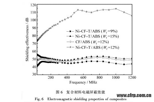 其中:μr為材料相對銅的磁導(dǎo)率;σr為材料相對銅的電導(dǎo)率;f為電磁波的頻率;t為材料厚度。因此,當材料厚度t和入射電磁波頻率f一定時,材料的電磁屏蔽效能主要與σr和μr有關(guān)。纖維表面金屬化后,σr和μr值增大,復(fù)合材料屏蔽效能增加。圖6是復(fù)合材料在30~1200MHz頻率范圍內(nèi)的電磁屏蔽效能曲線。由圖6可以看出,Wf=12%時,CF/ABS的屏蔽值在50dB左右,而Ni-CF-T/ABS的屏蔽值均在73dB以上,最高可達114dB。在500~1000MHz范圍內(nèi),碳纖維鍍鎳對電磁屏蔽性能的增強作用尤為顯著,屏蔽值提高60dB??梢?纖維表面金屬化可明顯提高材料的電磁屏蔽性能。同時,110dB的屏蔽值超過國外同類產(chǎn)品。