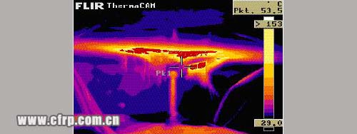 但是這是在沖擊發(fā)生后用10-15秒的紅外照相機(jī)拍攝到的照片;溫度等級圖表明洞四周的部分溫度已經(jīng)超過153°C,洞中間的碳纖維仍然在燃燒。