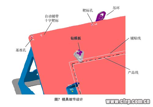 (6) 復(fù)材制件定位孔:也叫制件工藝耳片孔,用于復(fù)材制件在脫模后檢測、機(jī)加和裝配時(shí)作定位基準(zhǔn),精度要求高。此孔需要有相應(yīng)的鉆模板來準(zhǔn)確定位,鉆孔需要在脫模前進(jìn)行,孔應(yīng)該在模具的法線方向。 本文來自123