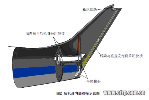 (1)后機身內(nèi)有兩個加強框,由上下兩個碳纖維復(fù)合材料件與蒙皮及垂直安定面后梁膠接組成,垂直安定面內(nèi)部有一個翼梁,采用碳纖維復(fù)合材料蜂窩夾層結(jié)構(gòu),采用膠接與蒙皮連接,如圖1、圖2所示。