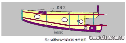 本文以某型號5座單噴渦槳通用飛機為原型機,介紹一下結(jié)構(gòu)膠粘劑在原型機上的具體應(yīng)用。此款飛機的整機結(jié)構(gòu)除了機翼主起加強肋和一些連接結(jié)構(gòu)件為金屬材料外,其余全為復(fù)合材料結(jié)構(gòu)件。飛機的機體結(jié)構(gòu)主要采用碳纖維復(fù)合材料蜂窩夾層結(jié)構(gòu)。各零部件的連接方式以膠接為主。下面主要介紹一下結(jié)構(gòu)膠粘劑在此款飛機上的應(yīng)用部位。