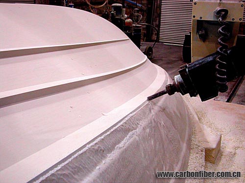 根據(jù)計(jì)算機(jī)數(shù)據(jù)進(jìn)行的CNC加工是非常精確的。母模生產(chǎn)用的可加工復(fù)合材料模具板和板材來(lái)自不同的制造商。這些產(chǎn)品范圍從聚氨酯泡沫、合成環(huán)氧樹(shù)脂到碳泡沫。這些材料粘結(jié)在一起后,被加工成特定的模具形狀,然后將其密封防止層壓樹(shù)脂滲透,并用雙馬來(lái)酰亞胺或環(huán)氧層壓板包覆,最后才進(jìn)行機(jī)加工。