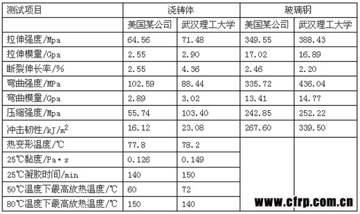 6.2 為改善工藝性,建議采用武漢理工大學(xué)材料學(xué)院復(fù)合材料系研發(fā)的高性能低黏度環(huán)氧樹脂。其已開發(fā)的樹脂玻璃化溫度(Tg)達(dá)190℃,黏度可低到80mPa•s,浸漬性大為提高。下面是武漢理工大學(xué)與美國(guó)某公司環(huán)氧樹脂實(shí)物的測(cè)試結(jié)果,可資比較參考。