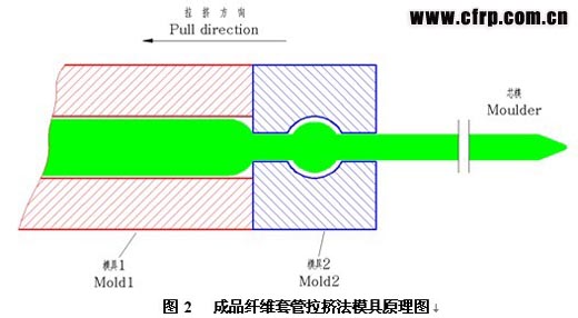 成品纖維套管拉擠法的模具原理如圖2所示。芯模左端以球形部分定位,使之軸向定位。