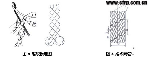 編織是一種古老的織造技術(shù)。編織物(braid)所有的纖維均斜交,與軸線夾角不呈0°與90°。編織原理與編織管如圖3、圖4所示。編織過程腫,纖維的運(yùn)動(dòng)軌跡為螺旋線。選擇合理的纖維角度可調(diào)節(jié)成品管材徑向強(qiáng)度與軸向強(qiáng)度的比例;選擇適宜的纖維排列密度可滿足強(qiáng)度與外觀的要求。
