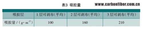 大型復(fù)合材料壁板因?yàn)楹穸茸兓?,所以各個(gè)區(qū)域余膠量分布不均,在制件制備過(guò)程中則要通過(guò)預(yù)吸膠環(huán)節(jié)控制各個(gè)區(qū)域厚度在標(biāo)準(zhǔn)范圍之內(nèi),這就要求我們對(duì)預(yù)吸膠工藝進(jìn)一步掌握。吸膠材料和吸膠時(shí)間是對(duì)吸膠量的關(guān)鍵影響因素,如表3和圖3所示。