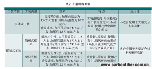 不同結(jié)構(gòu)形式的工裝,結(jié)合復(fù)合材料零件的實(shí)際制造情況,對(duì)復(fù)合材料的成型工藝過(guò)程會(huì)產(chǎn)生不同的影響,尤其是對(duì)復(fù)合材料零件固化過(guò)程中的加熱效率以及溫度均勻性的影響。具體情況如表2所示。