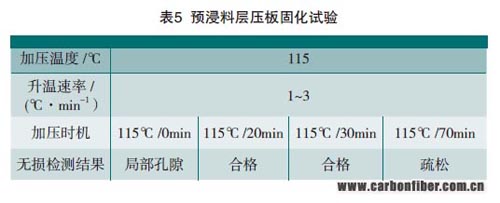 加壓點(diǎn)包括加壓溫度、加壓時(shí)機(jī)。加壓點(diǎn)的選擇, 首先是加壓溫度,加壓溫度過(guò)低則樹(shù)脂流動(dòng)性不好,纖維不易均勻浸潤(rùn)易造成缺陷;加壓溫度過(guò)高,樹(shù)脂聚合速率過(guò)快不易掌握加壓時(shí)機(jī)。其次在確定加壓溫度的前提下把握好加壓時(shí)機(jī),加壓時(shí)機(jī)過(guò)早則樹(shù)脂粘度低,排出樹(shù)脂過(guò)多造成零件貧膠、孔隙率高;加壓時(shí)機(jī)過(guò)晚則樹(shù)脂聚合程度高,流動(dòng)性差制件易夾雜氣泡產(chǎn)生疏松、分層等缺陷。加壓點(diǎn)的最佳選擇為樹(shù)脂由粘流態(tài)向高彈態(tài)轉(zhuǎn)變過(guò)程中的過(guò)渡區(qū)間。這和升溫速率、加壓溫度、加壓時(shí)機(jī)都密切相關(guān),不同的溫度—時(shí)間曲線有著不同的加壓點(diǎn)。目前經(jīng)常采用差熱分析儀和流變儀來(lái)了解樹(shù)脂的固化反應(yīng)過(guò)程和粘度變化過(guò)程,實(shí)際生產(chǎn)中也有用滑板法或拉絲法測(cè)定凝膠時(shí)間來(lái)了解樹(shù)脂在溫度—時(shí)間曲線各個(gè)點(diǎn)的粘度情況,如表4、表5所示。