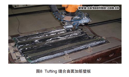 縫合時(shí)縫線(xiàn)幾乎處于自由狀態(tài),張力很小,僅靠縫線(xiàn)與預(yù)制體的靜摩擦力把縫線(xiàn)留在預(yù)制體內(nèi)部。因此,為了能保證縫線(xiàn)能順利留在預(yù)制體內(nèi)部,會(huì)在預(yù)制體鋪疊時(shí)加入少量定位膠黏劑來(lái)增大預(yù)制體與縫線(xiàn)的摩擦,從而保證縫合的順利進(jìn)行。在縫合泡沫夾芯預(yù)制體時(shí),定位膠黏劑作用不明顯,可以在預(yù)制體底部加襯一層薄橡膠,以達(dá)到留住縫線(xiàn)的效果,縫合完成后再取下橡膠。對(duì)于相對(duì)較薄的預(yù)制體也可以采用此種方法來(lái)提高Tufting縫合質(zhì)量。圖8是采用Tufting技術(shù) 縫合曲面加筋壁板。