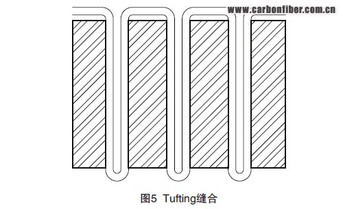 (3)Tufting縫合。同樣是依靠連接縫頭的懸臂機(jī)械手上完成復(fù)雜型面的縫合,在縫合時(shí)Tufting縫針只有在預(yù)制體內(nèi)穿進(jìn)和退出的簡(jiǎn)單動(dòng)作,所以Tufting縫合可適用于較厚的預(yù)制體縫合,Tufting縫合的最大縫合厚度可達(dá)30mm。采Tufting