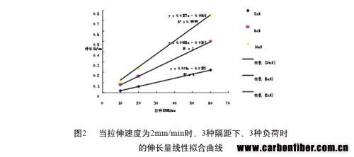 從圖2可以看出,在拉伸速度為2mm/min下,拉伸負(fù)荷分別達(dá)到2cN、6cN、10cN時(shí),拉伸隔距和測(cè)試結(jié)果的伸長(zhǎng)量為線性關(guān)系。