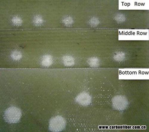 圖3 在采用鉤/環(huán)搭接的“互鎖型”Han-3D玻璃纖維織物(上)以及具有同樣重量的“非互鎖型”平織玻璃纖維織物(下)上所做的低速碰撞測試,兩種織物都是按0°、+45°、-45°、90°、0°、-45°、+45°和0°的順序依次鋪層、并由亨斯邁先進材料公司的Aradur 5003-1環(huán)氧樹脂進行真空灌注的一個8層織物。將試樣放入一個中心孔直徑為50mm的試驗夾具中,采用一個頭部直徑為12.7mm的沖擊桿在試樣的多處擊打數(shù)次(落錘1kg,落差80cm)。可以看出,采用Han-3D織物生產(chǎn)的復(fù)合材料上的凹痕相對較小,中間一排顯示出了僅在試驗夾具的落差由80cm降低到40cm后,平織的試樣上就出現(xiàn)了較小的凹痕印記