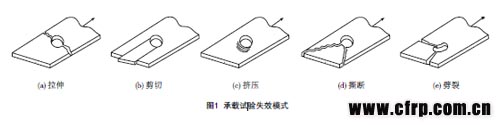 其中拉伸失效、剪切失效以及擠壓失效是因承受面內(nèi)載荷而發(fā)生的;當承受面外載荷時,緊固件還可能從接頭中拉出,即所謂的“拉脫”。層板的拉伸失效與基體和纖維的拉伸失效有關,通常發(fā)生于寬徑比很小,或者旁路載荷與緊固件承載比較大時。剪切破壞和擠壓破壞則主要是由纖維和基體的壓縮破壞引起的。拉伸破壞與剪切破壞是災難性的,而擠壓破壞則是隨載荷和時間慢慢累積的,是結(jié)構(gòu)局部的失效,不會帶來結(jié)構(gòu)的災難性破壞[8]。在以上幾種破壞模式的基礎上,隨載荷及時間的變化,當結(jié)構(gòu)擠壓破壞后,還可能發(fā)生一系列后續(xù)的破壞[9],如圖1中的(d)和(e)所示。實際應用中復材接頭可能存在多種破壞模式,發(fā)生混合破壞,使得接頭設計和分析更加困難[10]。