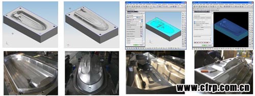 如圖3所示為對(duì)該艇身smc模壓成型的模具設(shè)計(jì)、模具數(shù)控加工編程以及模具實(shí)物。該模具結(jié)構(gòu)為封閉式、油循環(huán)加熱成型艇身。此種結(jié)構(gòu)較開放式、電加熱型模具,其產(chǎn)品重量可以嚴(yán)格控制、無飛邊、壁厚一致性好、加熱均勻、維修維護(hù)方便、模壓能耗低等多種優(yōu)點(diǎn)。模具設(shè)計(jì)最主要的為凸凹模凸凹模之間的接口配合設(shè)計(jì)對(duì)溢料飛邊的影響、加熱系統(tǒng)的設(shè)計(jì)、頂出機(jī)構(gòu)與模具的表面光潔度與修配余量的控制。